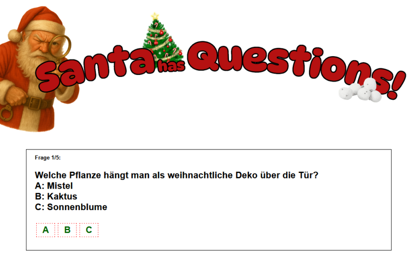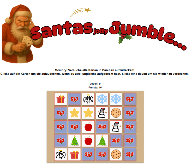 Zu unserem Adventskalender habe ich unter anderem die Weihnachtsrätsel beigetragen. Das Backend ist in Go mit Gin und Gorilla Websockets geschrieben. Die Sieger der Spiele konnten sich für ein Gewinnspiel qualifizieren.